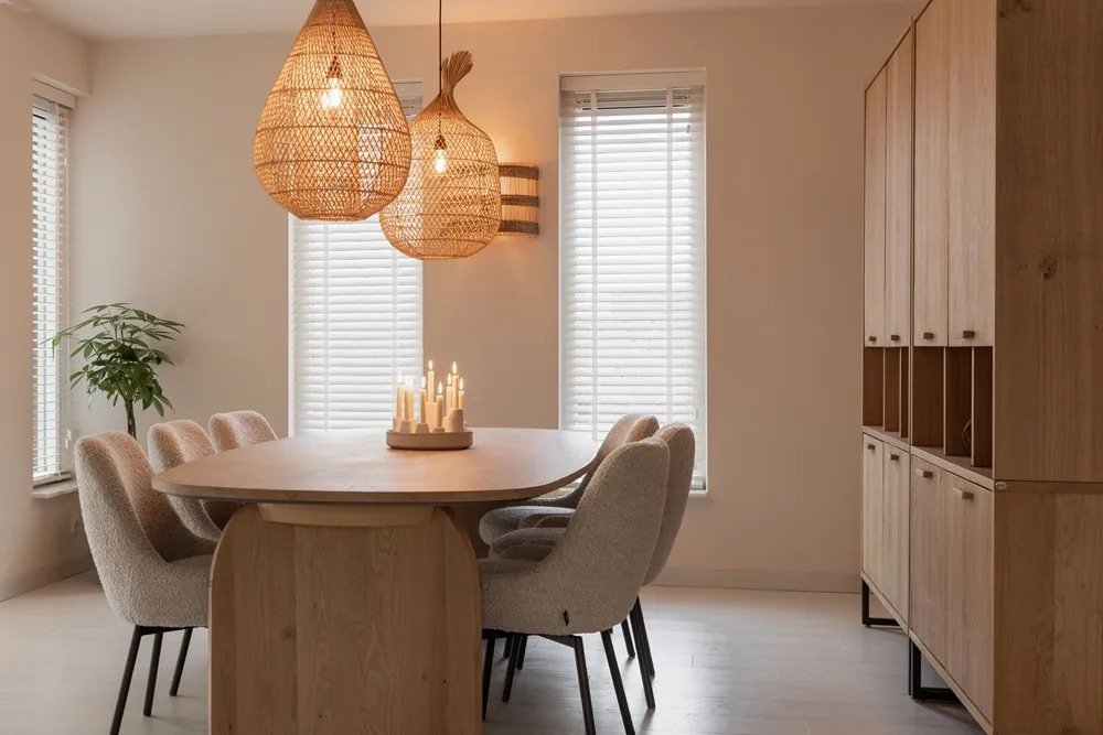 Vrijhangende raamdecoratie (vrijhangend plisségordijn en houten jaloezieën)